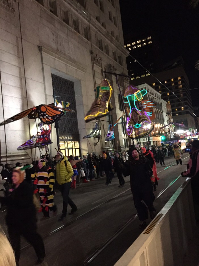 Now I was lucky enough to be in New Orleans for Mardis Gras season, during the week leading up the Fat Tuesday when the parades begin but the craziness has not yet reached its frenzied peak. The entire experience was completely enchanting. The first night we made two rookie mistakes. 1. We set up to watch toward the end of the parade route, not a bad thing except that we got there at the parade start time and it took about two hours of waiting before the parade made it to that point. We could have totally sat down and had a great meal beforehand, instead of standing around getting colder and colder. 2. We stood against the railing. This makes it impossible to get good goodies from the floats since you can’t walk up close enough to ask for trinkets directly. The second night we found a spot right next to one of the pay-to-sit stands which was awesome. The buildings worked to block the wind, we met some super nice locals standing nearby who told us some interesting facts (like that the people who carry the gas lights are homeless folks who they round up to parade and that historically you would try to bounce coins off of the lantern back board, but now you can just hand them spare change, since it is a way for them to make a few bucks) and we were handed a pass so we could go in and use the port-a-potty in the seating area- score! The first night we were at the parade known for handing out elaborately decorated purses, we were disappointed to not just not get a purse but not even see one. We did talk to a lady who said she got several purses and that the key was to go up and ask the people on the float for them. So the second night we knew to at least try to ask for the elaborate shoes they were giving out.